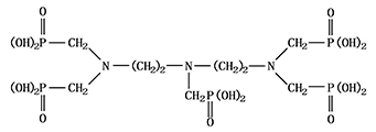 別名:二乙烯三胺五亞甲基膦酸 分子式:C9H28O15N3P5 相對(duì)分子質(zhì)量:573.2 結(jié)構(gòu)式: 一、性能與用途 DTPMPA無(wú)毒,易溶于酸性溶液中,阻垢緩蝕效果俱佳且耐溫性好,可抑制碳酸鹽、硫酸鹽垢的生成,在堿性環(huán)境和高溫下(210°C以上)阻垢緩蝕性能較其它有機(jī)膦好。DTPMPA在水處理中用作循環(huán)冷卻水和鍋爐水的阻垢緩蝕劑,特別適用于堿性循環(huán)冷卻水中作為不調(diào)pH的阻垢緩蝕劑,并可用于含碳酸鋇高的油田注水和冷卻水、鍋爐水的阻垢緩蝕劑;在復(fù)配藥劑中單獨(dú)使用本品,無(wú)需投加分散劑,污垢沉積量仍很小。 DTPMPA也可用作過(guò)氧化物穩(wěn)定劑(特別是高溫條件下雙氧水穩(wěn)定效果好)、紡織印染用螯合劑、顏料的分散劑、氧脫木素穩(wěn)定劑、化肥中微量元素?cái)y帶劑、混凝土添加劑。此外,在造紙、電鍍、金屬酸洗和化妝品等方面也得到了廣泛應(yīng)用。還可作氧化性殺菌劑的穩(wěn)定劑。 二、技術(shù)指標(biāo) 符合HG/T3777-2005