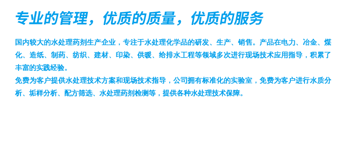 水處理藥劑產(chǎn)品:緩蝕阻垢劑、殺菌滅藻劑、清洗預(yù)膜劑、粘泥剝離劑、絮凝劑、聚丙烯酰胺、聚合氯化鋁、消泡劑、反滲透膜阻垢劑、鍋爐清洗劑、鍋爐除垢劑、蒸發(fā)阻垢劑、TRT緩蝕阻垢劑、除磷劑、氨氮去除劑、COD降解劑、生物除臭劑、中央空調(diào)水處理劑、污水處理藥劑、采暖水藥劑、有機(jī)膦系列產(chǎn)品。水處理劑產(chǎn)品主要應(yīng)用領(lǐng)域:循環(huán)冷卻水處理、污水處理、鍋爐水處理、反滲透水處理、中央空調(diào)水處理、采暖水處理等。